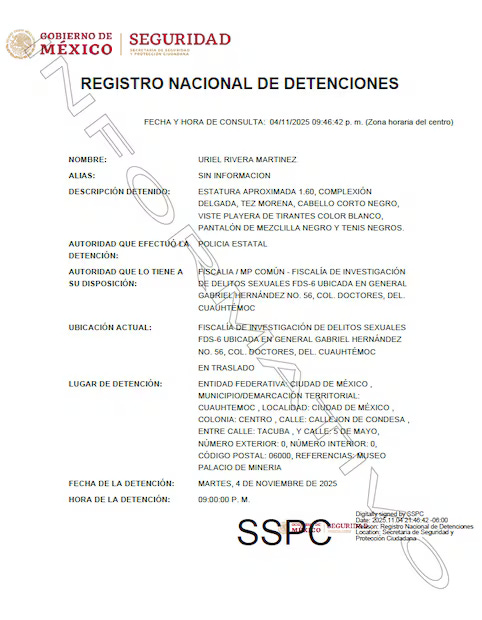 De acuerdo con el registro federal de detenciones, Uriel Rivera Martínez se encuentra ahora a disposición de la Fiscalía de Investigación de Delitos Sexuales de la Ciudad de México, ubicada en la colonia Doctores.
