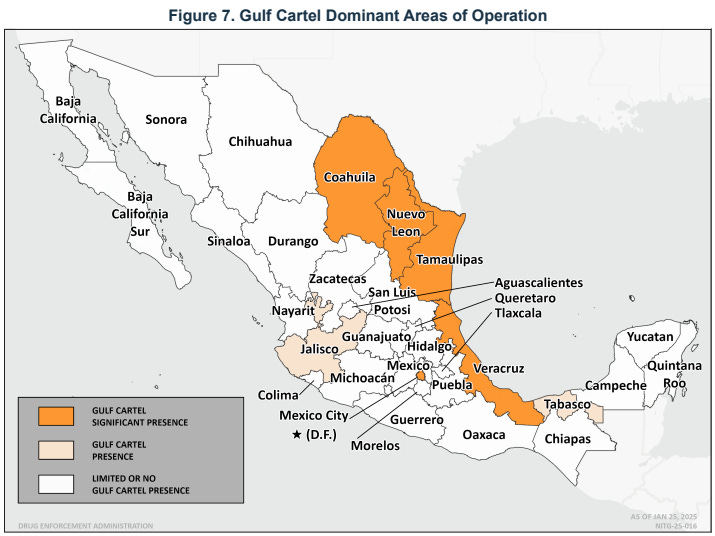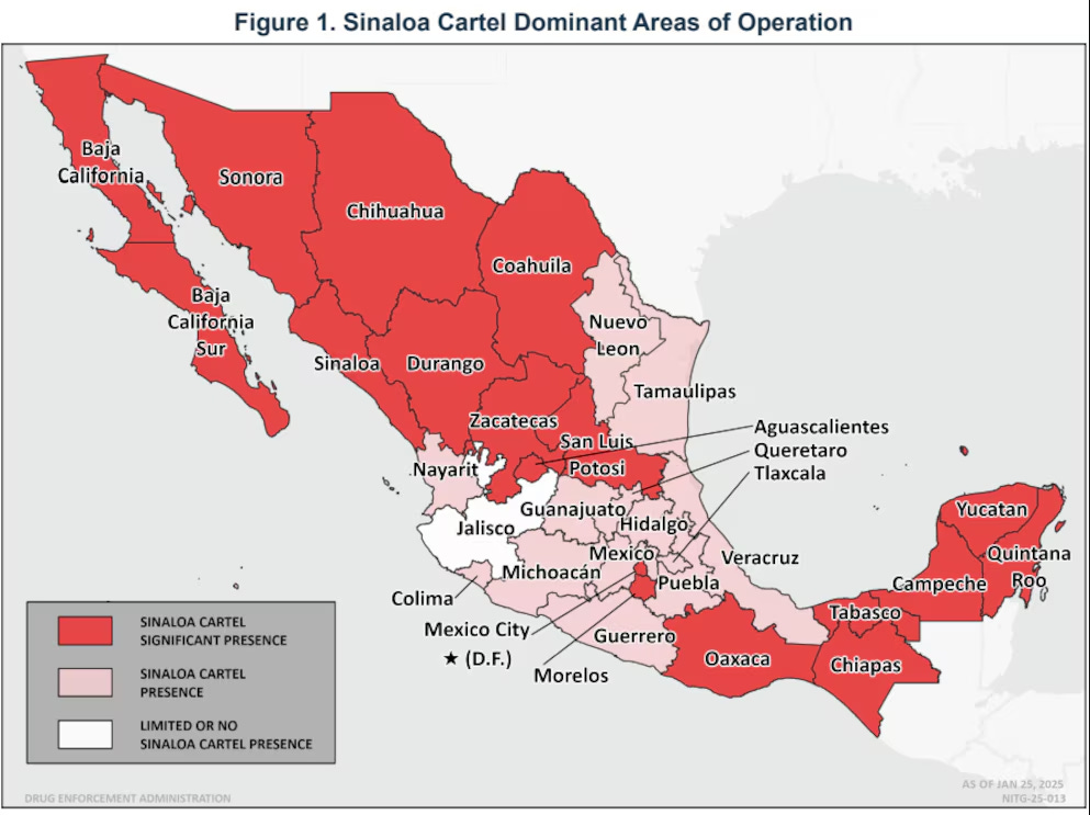 - Cártel de Sinaloa: Tiene un control “significativo” en las regiones norte y sur del país, particularmente en Baja California, Sonora, Sinaloa, Chihuahua, Coahuila, Nuevo León, Veracruz, Puebla, Tlaxcala, Oaxaca, Chiapas, Campeche, Yucatán y Quintana Roo. Sin embargo, su influencia es limitada en Jalisco, bastión del CJNG, y reducida en Nuevo León, Tamaulipas y Veracruz. La DEA señala que este cártel utiliza puertos del Pacífico, como Manzanillo y Lázaro Cárdenas, para importar precursores químicos destinados a laboratorios clandestinos.