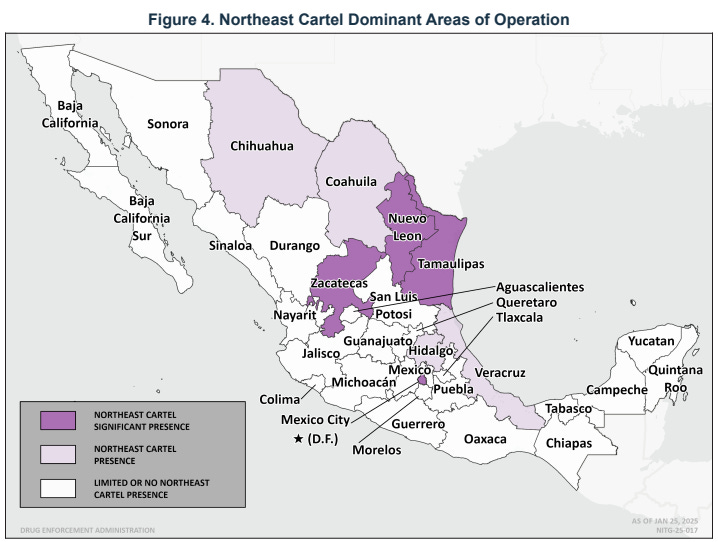 - Cártel del Noreste: Opera en Nuevo León, Tamaulipas y Zacatecas.