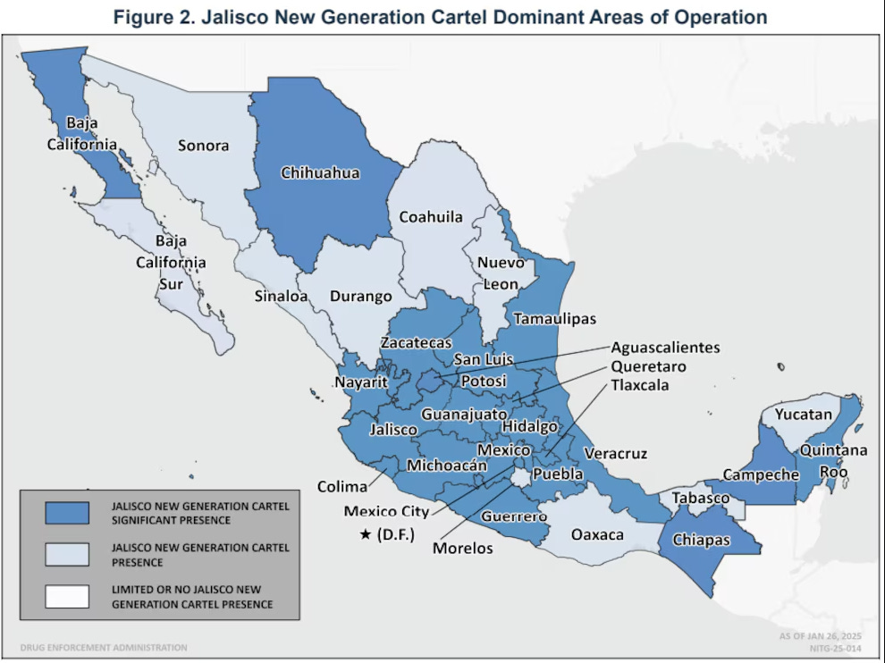 - Cártel Jalisco Nueva Generación (CJNG): Es el único cártel con presencia operativa en los 32 estados de México, aunque en algunos casos de manera limitada. Domina Jalisco, Nayarit, Colima, Veracruz, Guanajuato, Puebla, Querétaro e Hidalgo, y tiene fuerte presencia en Baja California, Chihuahua, Zacatecas, San Luis Potosí, Quintana Roo, Campeche, Chiapas, Michoacán, Guerrero y la Ciudad de México. Su control sobre puertos clave como Veracruz y Manzanillo facilita la importación de precursores químicos desde Asia.
