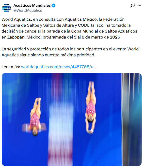 Jalisco.- La Federación Internacional de Natación (World Aquatics) anunció ayer la cancelación de la parada de la Copa Mundial de Saltos Acuáticos en Zapopan, Jalisco, programada del 5 al 8 de marzo de 2026. Tras consultas con la Federación Mexicana de Natación, la de Saltos y el CODE Jalisco, la decisión se basa en alertas de viaje emitidas por embajadas internacionales que desaconsejan visitas a México, impidiendo la participación de equipos extranjeros. Esto surge directamente de la ola de violencia desatada en Jalisco tras el abatimiento de Nemesio Oseguera Cervantes, ‘El Mencho’, líder del Cártel Jalisco Nueva Generación (CJNG), con narcobloqueos e incendios que paralizaron la región el fin de semana pasado.