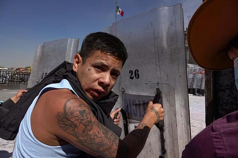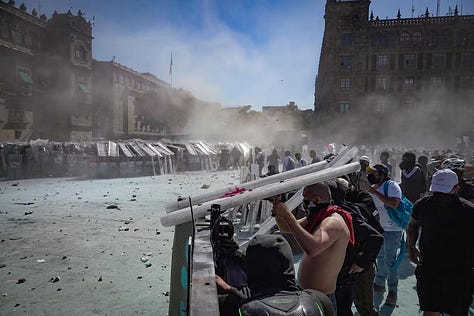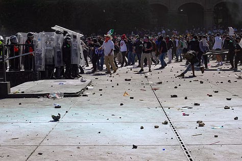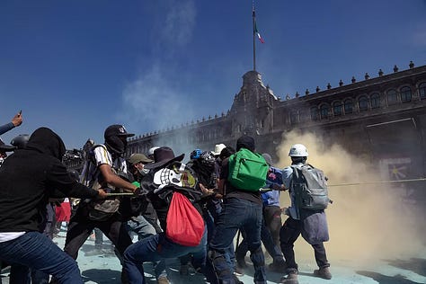 Videos virales capturaron el momento preciso: con cuerdas improvisadas y martillos, los jóvenes derribaron al menos 10 a 12 secciones metálicas en la calle Pino Suárez y al costado derecho del Palacio, abriendo brechas que permitieron a decenas escalar las estructuras restantes. “¡Policía escucha, esta es tu lucha!”, gritaban algunos manifestantes en un intento por unir fuerzas, mientras otros bailaban sobre las placas caídas al ritmo de “Gimme the Power”. Pero la respuesta policial fue inmediata y contundente: elementos antimotines, respaldados por 800 uniformados desplegados, formaron un “muro humano” con escudos y lanzaron nubes de gas lacrimógeno, polvo de extintores, piedras y hasta esferas en llamas para replegar a la multitud. La confrontación se volvió cuerpo a cuerpo –golpes, empujones y pedradas–, con reportes de agresiones directas contra civiles desprotegidos, incluyendo a una mujer policía herida en el rostro.