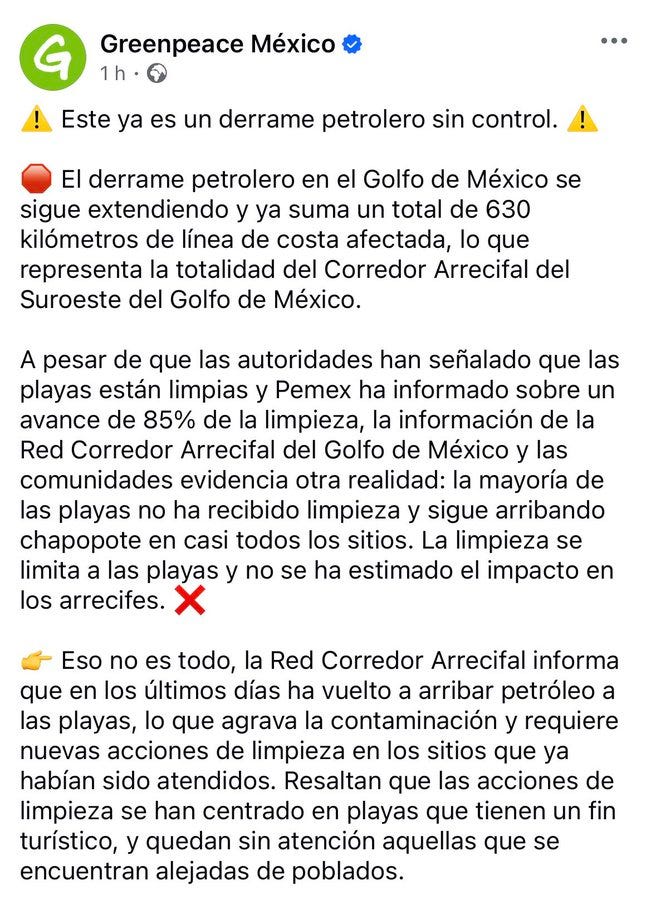 CDMX.- Un derrame de hidrocarburos lleva tres semanas envenenando el Golfo de México. Arrancó el 1 de marzo en Pajapan, Veracruz, y ya cubre más de 630 kilómetros de costa hasta Tuxpan, Tamiahua y Paraíso, Tabasco. Chapopote en playas donde desovan tortugas y descansan aves migratorias. Muertes de delfines, tortugas y pelícanos confirmadas. Pescadores con redes perdidas y turismo en ruinas justo antes de Semana Santa. Greenpeace México lo llama claro: derrame petrolero sin control que afecta todo el Corredor Arrecifal del Suroeste.