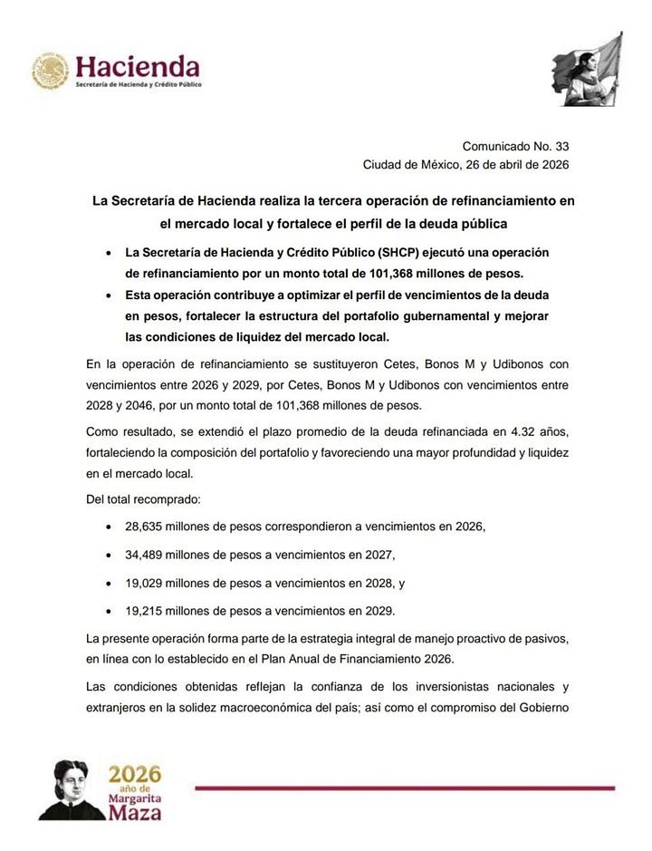CDMX.- La Secretaría de Hacienda ejecutó este fin de semana su tercera operación de refinanciamiento del año en el mercado local por 101,368 millones de pesos. Sustituyó Cetes, Bonos M y Udibonos con vencimientos entre 2026 y 2029 por instrumentos nuevos que maduran hasta 2046. El resultado oficial: el plazo promedio de esa porción de deuda se extendió 4.32 años. Según el comunicado 33 de la propia SHCP, es un movimiento “proactivo” para mejorar el perfil y dar liquidez al mercado.