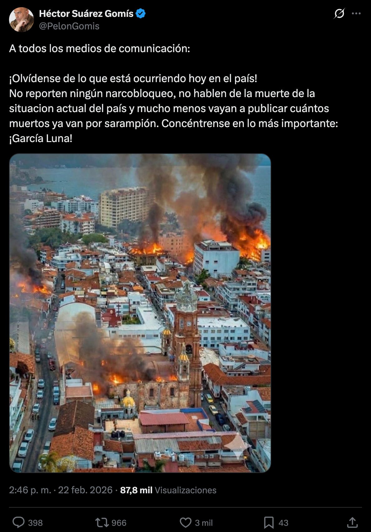 CDMX.- Héctor Suárez Gomís no se mordió la lengua en su post en X: una sátira mordaz donde insta a los medios a ignorar el caos nacional –narcobloqueos en Jalisco, Michoacán, Guanajuato y más tras el abatimiento de ‘El Mencho’ en Tapalpa– y el brote de sarampión que ya suma 10,085 casos confirmados y 31 muertes en ocho estados, con Chihuahua a la cabeza con 21 fallecidos. En cambio, Gomís ironiza, enfóquense en García Luna, el distractor favorito del gobierno.