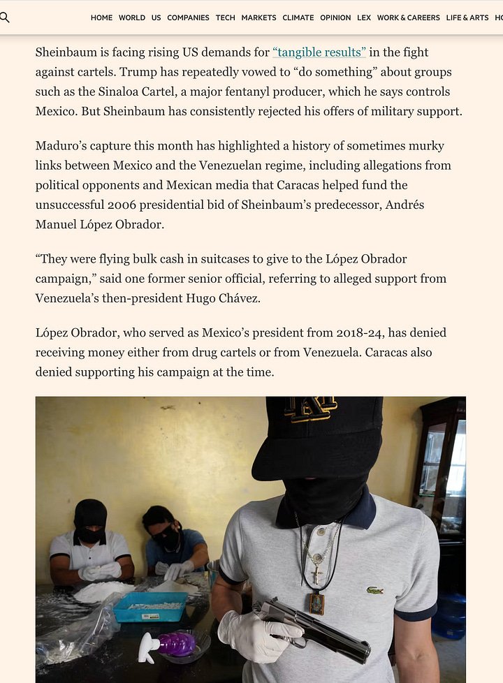 CDMX.- Un reciente artículo del Financial Times, publicado a inicios de febrero de 2026, cita a un ex alto funcionario mexicano anónimo que asegura ante autoridades estadounidenses que Hugo Chávez envió “grandes cantidades de dinero en maletas” para financiar la campaña presidencial de Andrés Manuel López Obrador en 2006. El texto, titulado “Mexico in Trump’s sights as drug ties to Venezuela loom large” (“México en la mira de Trump mientras los lazos con el narcotráfico venezolano se intensifican”), enmarca estas alegaciones en un análisis de los históricos lazos entre México y Venezuela, exacerbados por la captura de Nicolás Maduro y presiones de la administración Trump sobre narcotráfico. López Obrador ha negado repetidamente cualquier financiamiento de Caracas o carteles, y el gobierno venezolano rechazó similares acusaciones en el pasado.