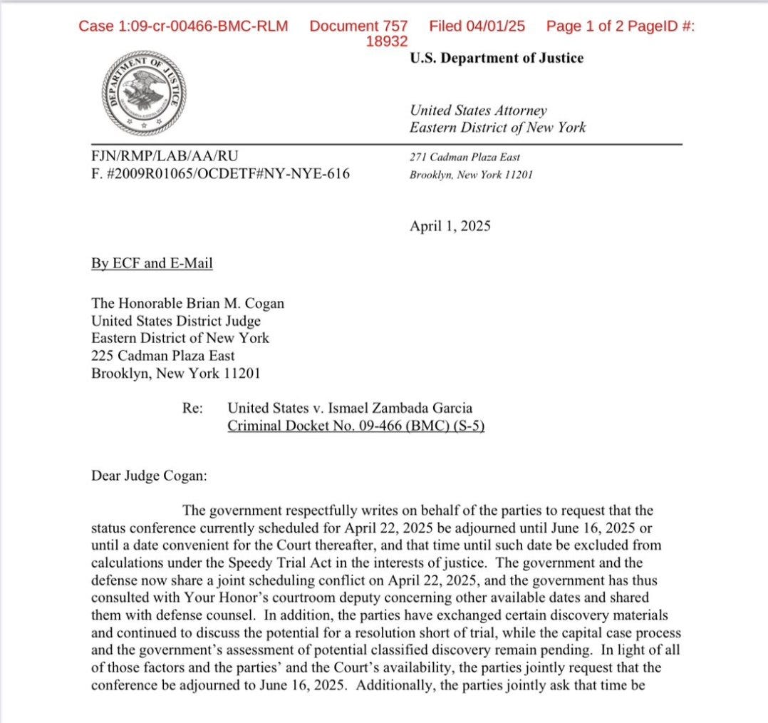 Las negociaciones para un posible acuerdo comenzaron desde enero de 2025, aunque hasta ese momento no se había llegado a un consenso. En febrero, el abogado de Zambada, Frank Perez, confirmó a Reuters que su cliente estaba dispuesto a declararse culpable siempre y cuando se descartara la pena capital. Ahora, un nuevo documento judicial revela que las partes han solicitado más tiempo para continuar las discusiones, posponiendo una audiencia programada para abril hasta junio de 2025. El caso está siendo supervisado por el juez Brian M. Cogan, conocido por manejar casos de alto perfil relacionados con el narcotráfico.