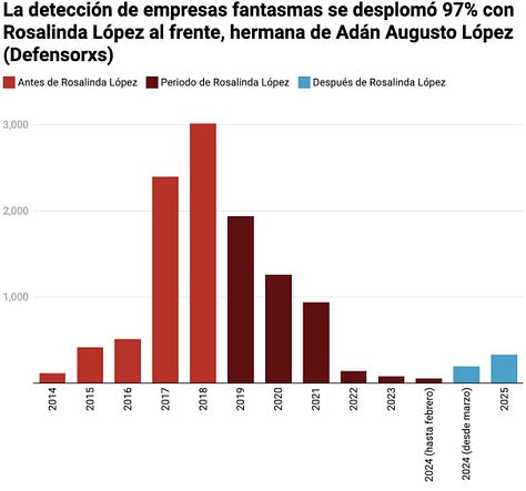 Durante su gestión en el SAT (2018-2024), Rosalinda López Hernández, hermana de Adán Augusto López, redujo la detección de empresas fantasma un 97.3%, según datos de Miguel Alfonso Meza