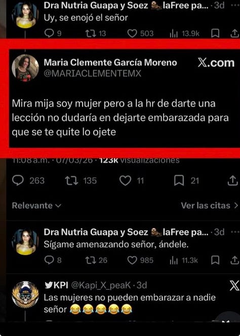 María Clemente García Moreno amenaza con "dejar embarazada" a una usuaria en X