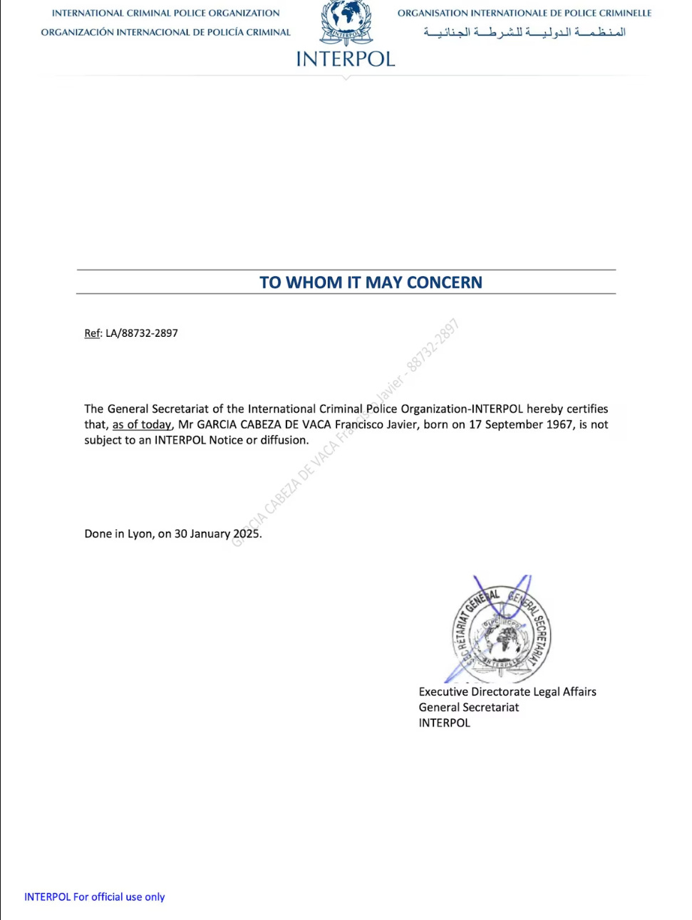 Adjunto a su publicación, el exgobernador compartió un documento de la Interpol con fecha del 30 de enero de 2025, que certifica que, hasta esa fecha, no es sujeto a notificación o difusión por parte de la institución.