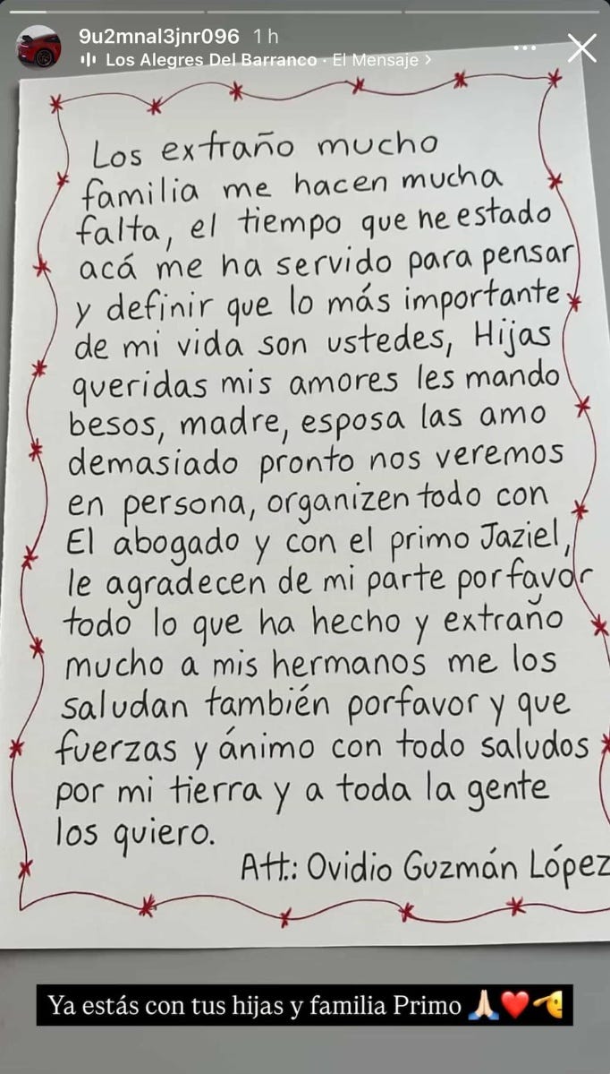 La supuesta carta escrita por Ovidio Guzmán fue difundida en Instagram por la cuenta 9u2mmal3jnr096, acompañada de la canción “El Mensaje” del grupo Los Alegres del Barranco, según reportó Illicit Investigations en X (@illicitinv). En el documento, Ovidio expresa su afecto por su esposa, hijas y madre, escribiendo: “Los extraño mucho familia, el tiempo que he estado acá me ha servido para pensar y definir que lo más importante de mi vida son ustedes”. Además, instruye a su familia a organizar asuntos con un abogado y con su primo Jaziel, a quien agradece por su apoyo: “Pronto nos veremos en persona, organicen todo con el abogado y con el primo Jaziel, le agradecen de mi parte por favor todo lo que ha hecho”. La carta también incluye saludos a sus hermanos, un mensaje de ánimo y fuerza, y un reconocimiento a su tierra y su gente. Hasta el momento, no hay confirmación oficial sobre la veracidad de este documento.