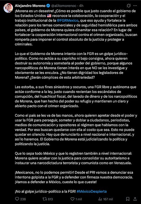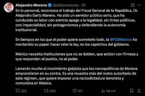 El líder priista Alejandro “Alito” Moreno no tardó en detonar: calificó la salida como un “desastre” y un “golpe jurídico-político” orquestado por Morena para “dinamitar” la relación con Washington y blindar a “narcopolíticos” implicados en corrupción y huachicol fiscal. “Usarán la FGR para perseguir, someter y doblar a ciudadanos, periodistas y opositores”, advirtió, evocando un autoritarismo al estilo venezolano. Su denuncia, que incluye alertas internacionales, resuena en un PRI debilitado pero combativo, aunque críticos recuerdan que Gertz mismo fue acusado de parcialidad durante el sexenio anterior, con investigaciones selectivas que beneficiaron al oficialismo.