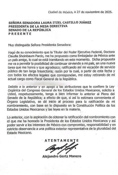 CDMX.- A sus 86 años, Alejandro Gertz Manero presentó este jueves 27 de noviembre su renuncia irrevocable como fiscal general de la República, dos años antes de que concluyera su mandato en enero de 2028. Nombrado en 2019 por Andrés Manuel López Obrador, Gertz deja el cargo tras una negociación discreta con el gobierno de Claudia Sheinbaum, quien le ofreció el puesto de embajador en un “país amigo” para honrar su larga trayectoria en el servicio público. La carta, dirigida al Senado y leída en pleno, subraya su “vocación de servicio”, pero llega en un momento delicado: apenas esta semana, Estados Unidos reconoció la colaboración de la FGR en temas de narcotráfico y extradiciones, un lazo que ahora genera temores de ruptura.