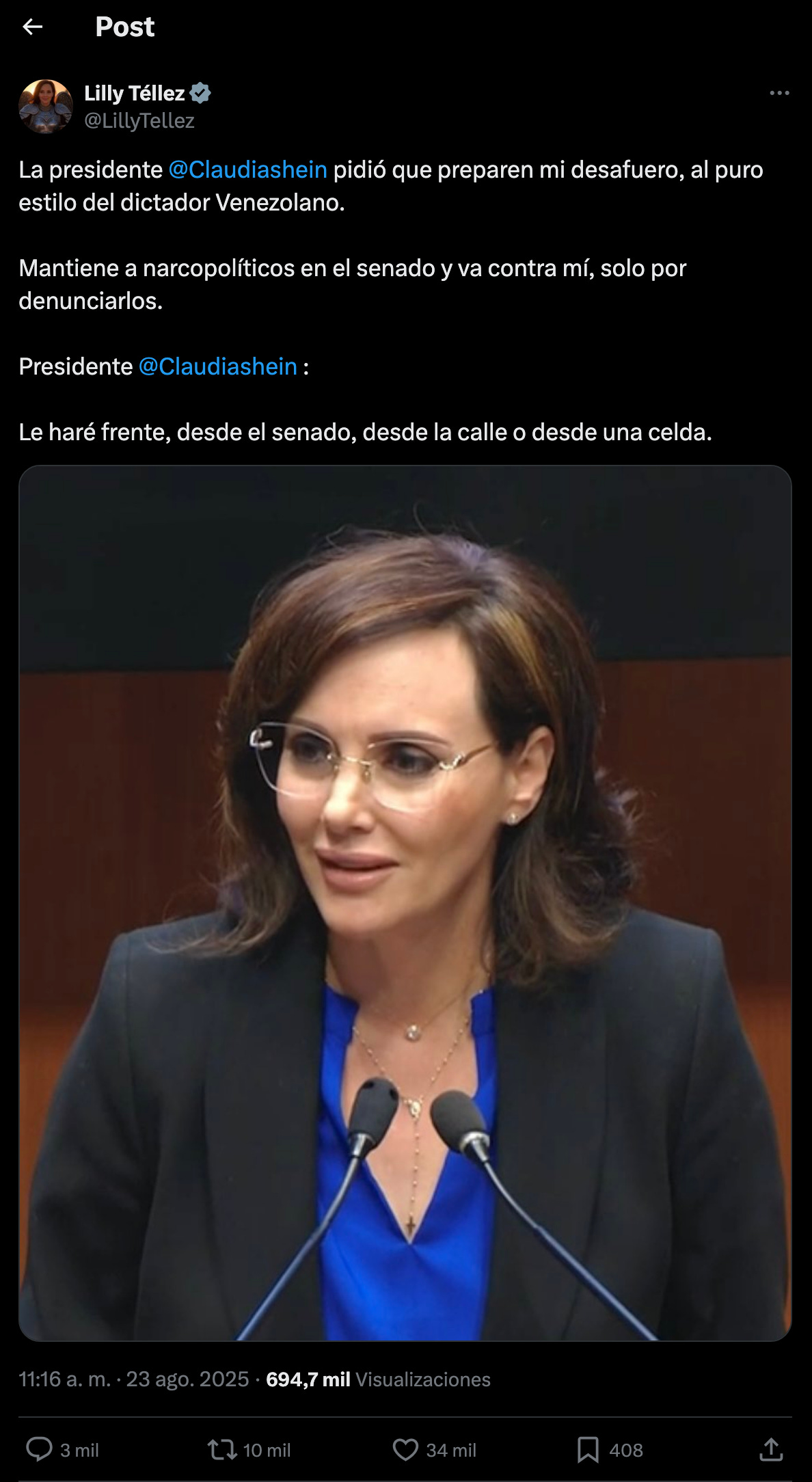 EU.- En una entrevista explosiva con Fox News, la senadora panista Lilly Téllez no se mordió la lengua: "Sí, tengo miedo", respondió cuando le preguntaron si temía por su vida al exponer la supuesta infiltración de los cárteles en el gobierno mexicano. Pero no se detuvo ahí; acusó al presidente Claudia Sheinbaum de amenazarla con persecución penal para sacarla del Senado, todo por revelar en ese espacio lo que llama "la realidad narco" de México, donde los cárteles dominan estados, ciudades y hasta el gobierno federal.