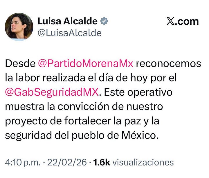 CDMX.- En un acto cobarde y manipulador, Luisa Alcalde, presidenta nacional de Morena, borró su tuit original donde felicitaba directamente a la presidenta Claudia Sheinbaum por “abatir al Mencho”, el líder del Cártel Jalisco Nueva Generación (CJNG), y lo sustituyó por uno genérico que solo menciona al Gabinete de Seguridad. Este incidente, expuesto por usuarios en X con capturas de pantalla, ocurrió tras el operativo del 22 de febrero de 2026 en Tapalpa, Jalisco, donde Nemesio Oseguera Cervantes murió en un enfrentamiento con fuerzas mexicanas —confirmado por Sheinbaum en su mañanera y reportes de Sedena, con inteligencia de EU—. El caos subsiguiente incluyó narcobloqueos en 14 estados, quema de vehículos y al menos 25 agentes de la Guardia Nacional muertos, según fuentes oficiales.