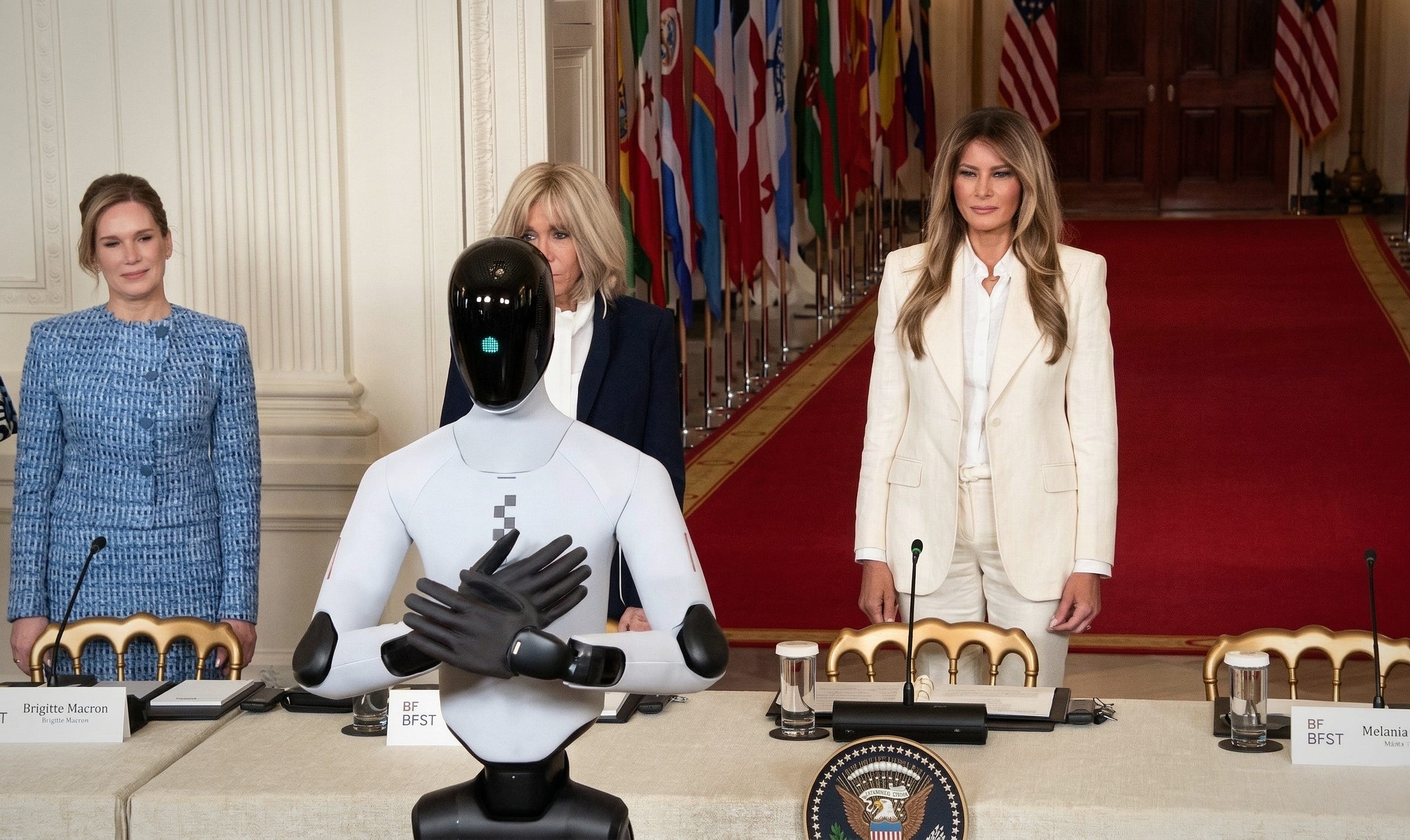 “Es justo decir que eres mi primer invitado humanoide hecho en Estados Unidos en la Casa Blanca”, bromeó la primera dama ante los asistentes.