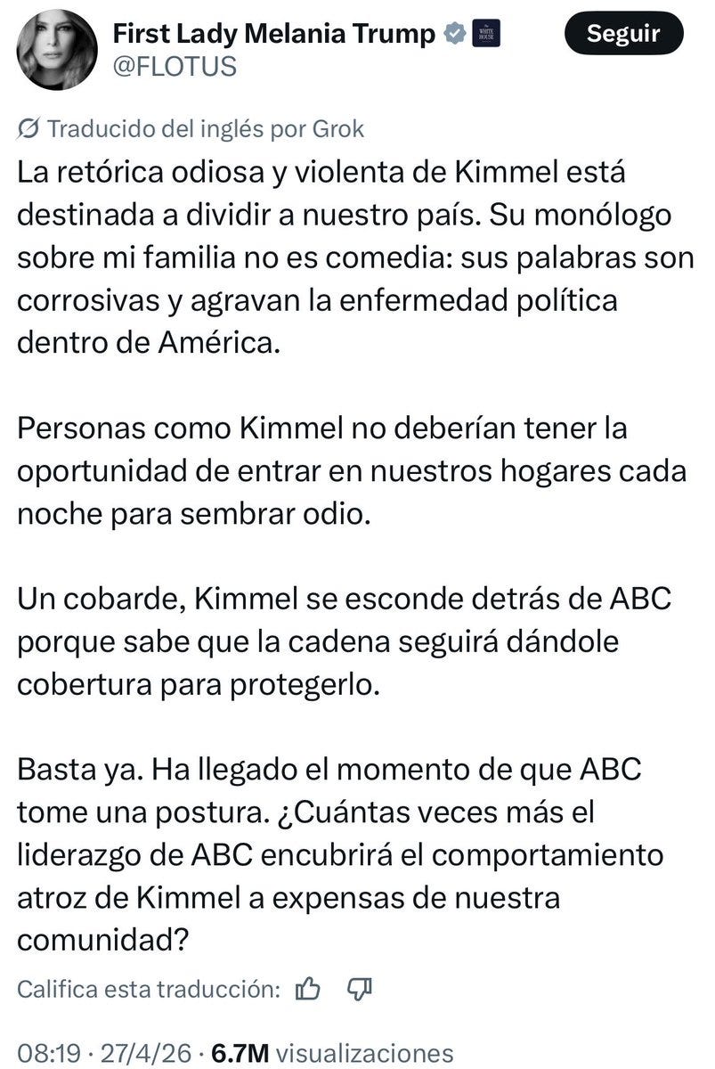 EU.- Tras el atentado del sábado 25 de abril en la cena de corresponsales de la Casa Blanca —donde un hombre armado irrumpió y obligó a evacuar de emergencia a Donald Trump, Melania y altos funcionarios—, la primera dama rompió el silencio con un mensaje demoledor. Jimmy Kimmel, en su monólogo del jueves anterior en ABC, había bromeado con que Melania tenía “el brillo de una viuda expectante”. Ella lo acusó directamente: “Su retórica odiosa y violenta divide al país. No es comedia, son palabras corrosivas que agravan la enfermedad política”. Y remató: “Basta ya. Ha llegado el momento de que ABC tome una postura”.