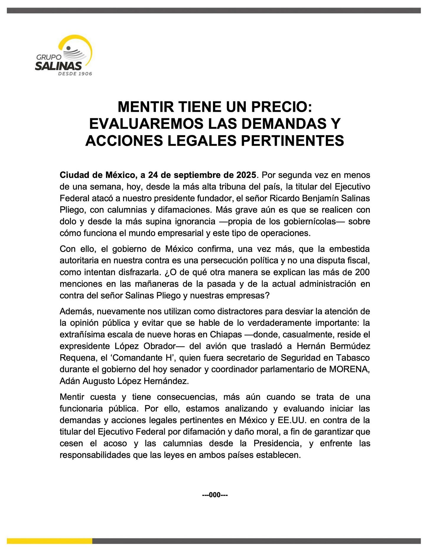 CDMX.- En un giro que enciende las alarmas sobre el uso del poder en México, Grupo Salinas, encabezado por Ricardo Salinas Pliego, anunció este miércoles que evaluará demandas legales en México y Estados Unidos contra el gobierno federal. La razón: acusan a la presidencia de lanzar calumnias y difamaciones desde la mañanera, un espacio que bajo la administración de Claudia Sheinbaum se ha convertido en un ring político. El comunicado, firmado por la empresa fundada en 1906, sostiene que estas acusaciones, supuestamente basadas en “ignorancia” sobre el mundo empresarial, esconden una persecución política más que un conflicto fiscal.