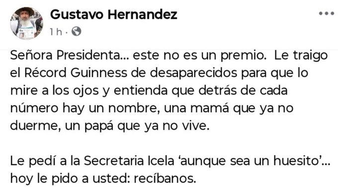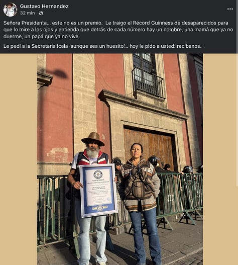 CDMX.- Con un certificado satírico que imita los Récords Guinness —porque el verdadero no premia tragedias—, un grupo de padres buscadores plantó este lunes frente a Palacio Nacional la vergüenza nacional: México es el país con más personas desaparecidas del planeta. Gustavo Hernández, el mismo padre que hace meses suplicó “aunque sea un huesito” de su hijo, cargó el documento simbólico exigiendo que Claudia Sheinbaum los recibiera. La respuesta fue el silencio sepulcral de siempre.