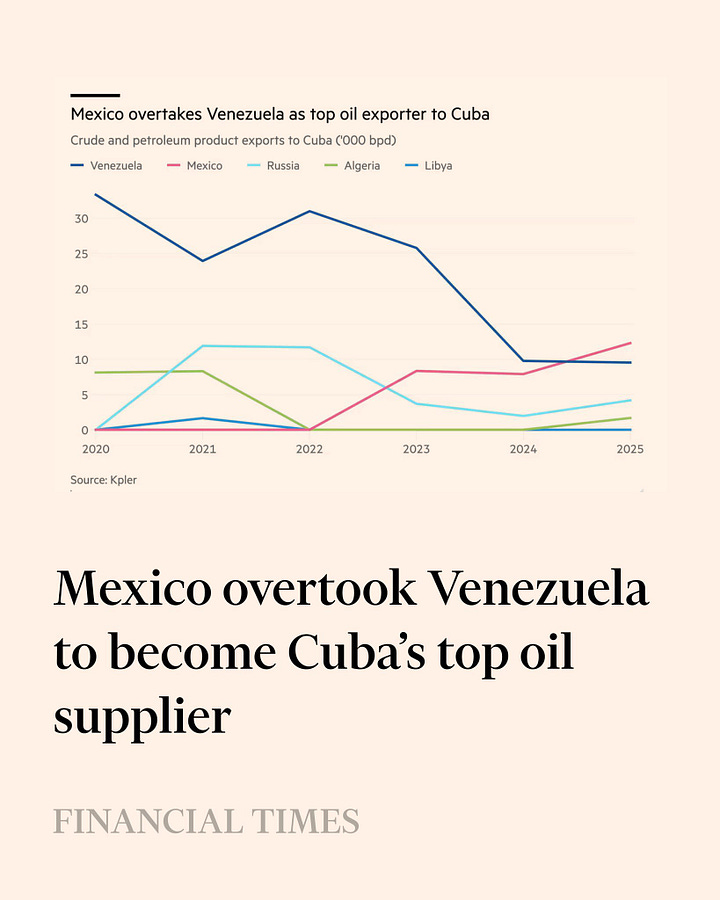 CDMX.- Según un reporte exclusivo del Financial Times basado en datos de Kpler, México superó a Venezuela en 2025 como el principal exportador de crudo y derivados petroleros a Cuba. Las exportaciones mexicanas crecieron un 56% respecto al año anterior, alcanzando entre 12 y 15 mil barriles por día (bpd), lo que representa cerca del 44% del total importado por la isla. En contraste, los envíos venezolanos cayeron drásticamente de 30 mil bpd en 2020 a casi cero, debido al colapso productivo y las sanciones estadounidenses, mientras que Rusia y Argelia mantienen volúmenes estables en torno a los 8-10 mil bpd cada uno.