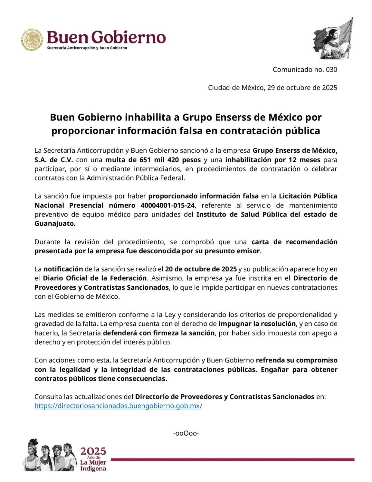CDMX.- La Secretaría Anticorrupción y Buen Gobierno (SABG) anunció este miércoles la sanción a Grupo Enserss de México, S.A. de C.V., a la que impuso una multa de 651 mil 420 pesos y una inhabilitación de 12 meses por falsear información en un proceso de contratación pública. El caso, relacionado con el mantenimiento de equipo médico para el Instituto de Salud Pública de Guanajuato, destapó una carta de recomendación falsa que la empresa presentó, lo que llevó a su registro en el Directorio de Proveedores y Contratistas Sancionados.