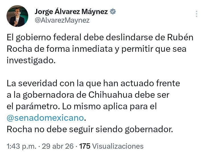 - Movimiento Ciudadano, a través de Jorge Álvarez Máynez, fue directo: “Rocha no debe seguir siendo gobernador”. Pidió que el gobierno federal se deslinde y deje investigar.