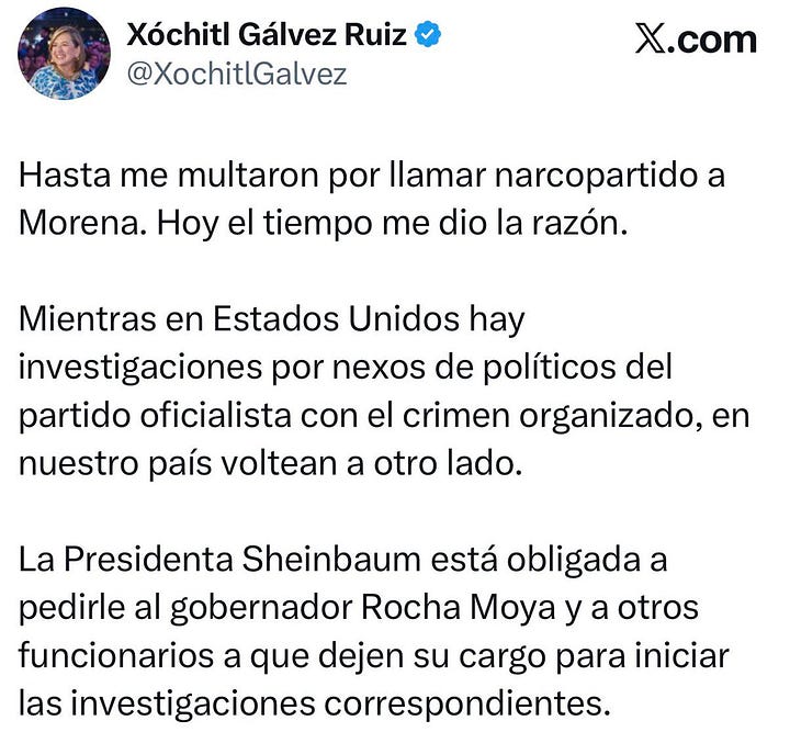 - Xóchitl Gálvez remató: “Hasta me multaron por llamar narcopartido a Morena. Hoy el tiempo me dio la razón”. Y exigió que Claudia Sheinbaum pida la separación inmediata de Rocha y los señalados.