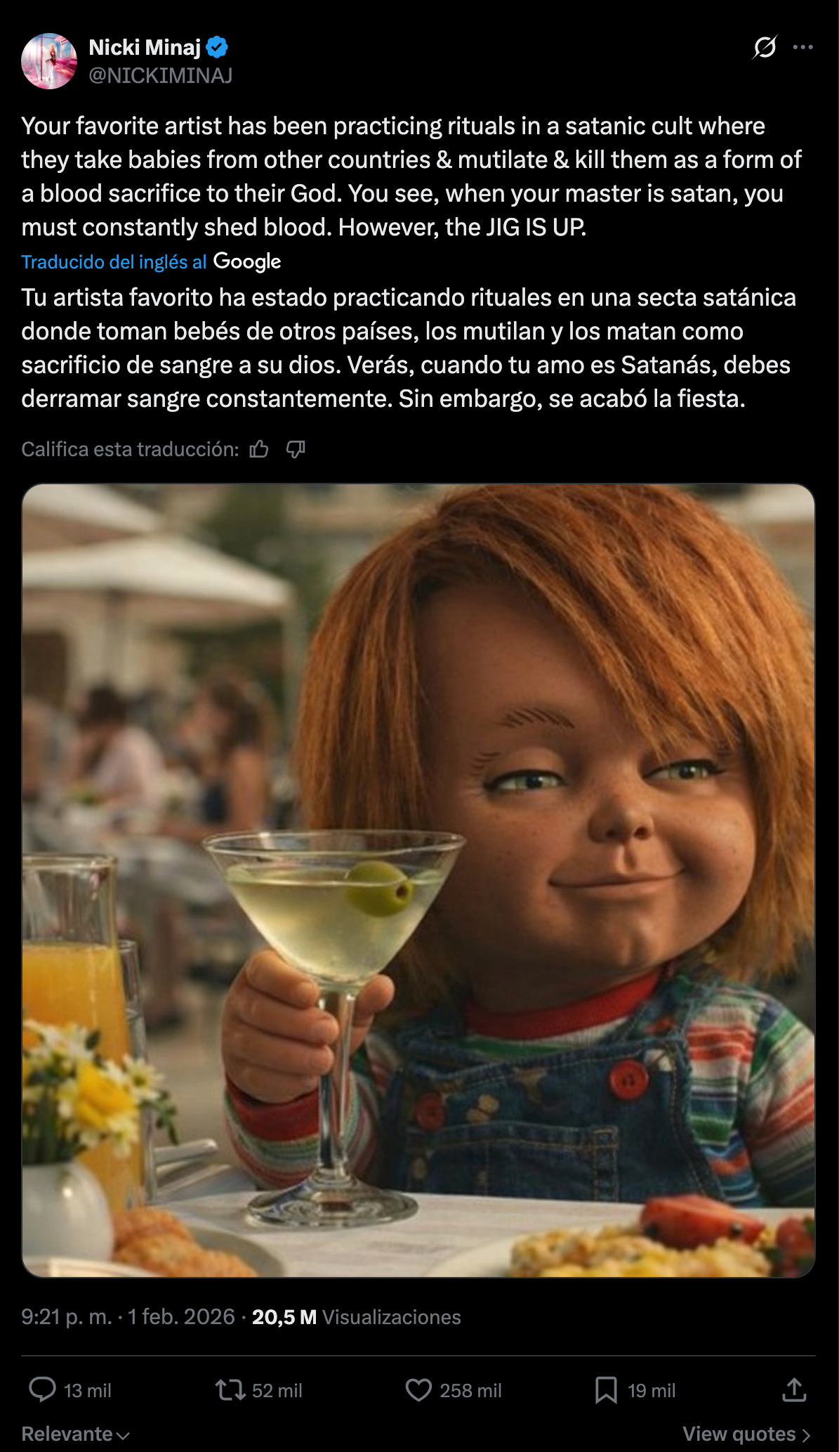 EU.- En una publicación explosiva en X, Nicki Minaj sacudió el mundo del entretenimiento al afirmar que “tu artista favorito ha estado practicando rituales en un culto satánico donde toman bebés de otros países y los mutilan y matan como sacrificio de sangre a su dios”. El tuit, compartido el 1 de febrero de 2026, llegó horas después de que Trevor Noah la mencionara en los Grammys bromeando sobre su cercanía con Donald Trump, lo que parece haber encendido la mecha. Dom Lucre, un periodista controvertido, amplificó el mensaje asegurando que la industria de las celebridades está “en llamas”, aunque sin pruebas concretas.