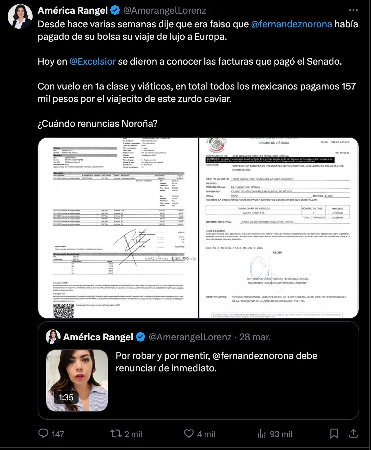 CDMX.- América Rangel, política mexicana de la oposición, destapó que Gerardo Fernández Noroña, figura destacada del partido Morena, viajó a Europa en primera clase con dinero público, contradiciendo sus afirmaciones previas de haber pagado el viaje de su bolsillo. Esta revelación llega después de que Rangel acusara a Noroña de mentir sobre sus gastos de viaje, acusación que ahora está respaldada por documentos oficiales del Senado mexicano, los cuales revelan un costo total de 157,000 pesos (alrededor de 7,850 dólares) para el viaje, incluyendo boleto de primera clase y viáticos.