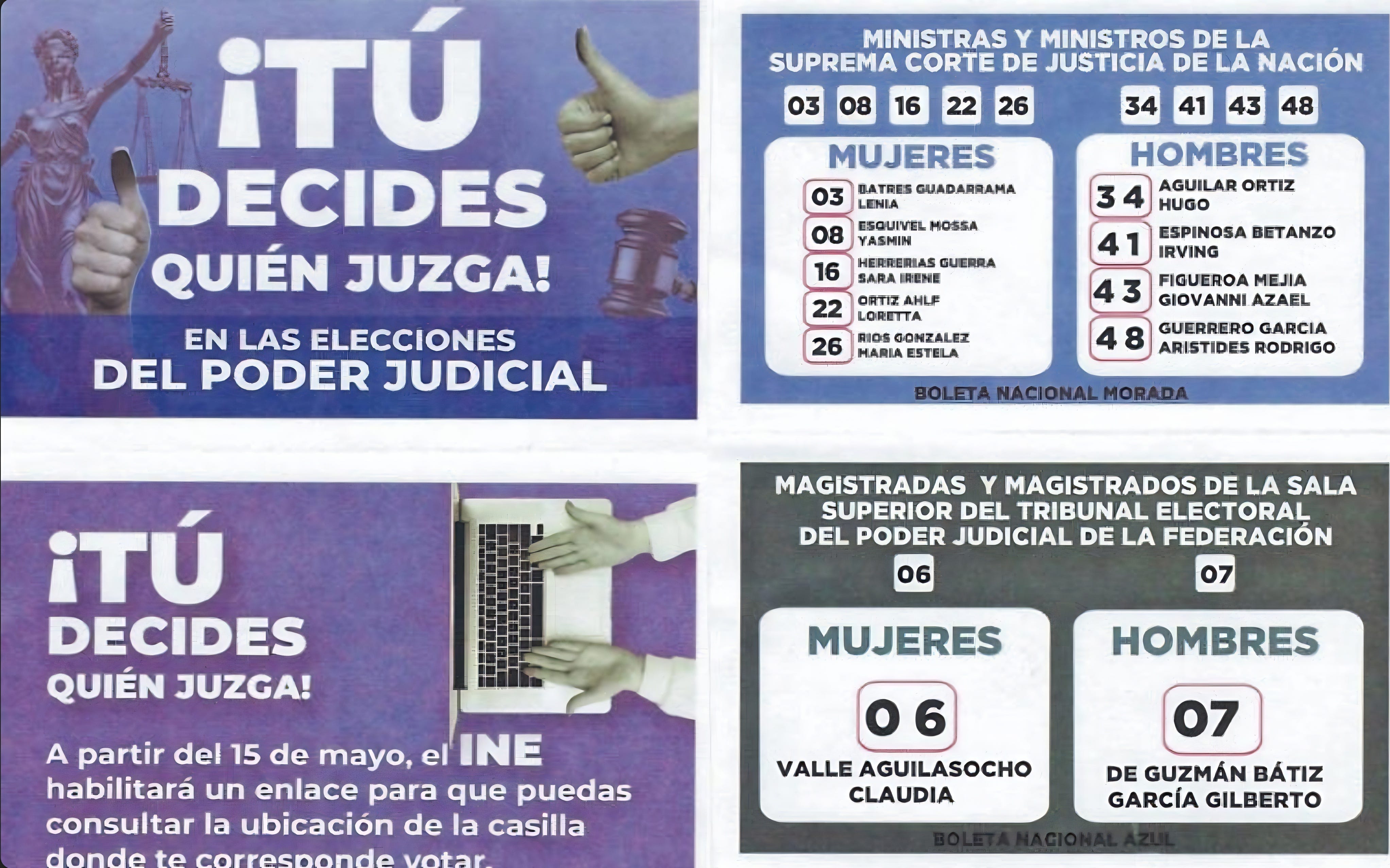 Los “acordeones” contienen listas detalladas de candidatos cercanos a Morena para diversos cargos, incluyendo la Suprema Corte de Justicia de la Nación (SCJN), donde se promocionan nombres como Lenia Batres, Yasmín Esquivel, Loretta Ortiz, Sara Herrerías, María Estela Ríos, Hugo Aguilar, Irving Espinoza, Giovanni Figueroa y Arístides Guerrero. También se incluyen recomendaciones para magistrados del TEPJF, como Claudia Valle Aguilasocho y Gilberto de Guzmán Bátiz, y para el Tribunal de Disciplina Judicial, con figuras como Bernardo Bátiz, Verónica de Gyves Zárate, Indira García, Celia Maya García y Rufino León Tovar. Asimismo, se mencionan candidatos a magistraturas de Salas Regionales y Circuitos, como María Cecilia Guevara, Ixel Mendoza Aragón, José Luis Ceballos Daza, Belem Martínez Bolaños, Emma Rivera Contreras, Julio Antonio Sánchez Pedrero y Mirsha Rodrigo León Carmona.