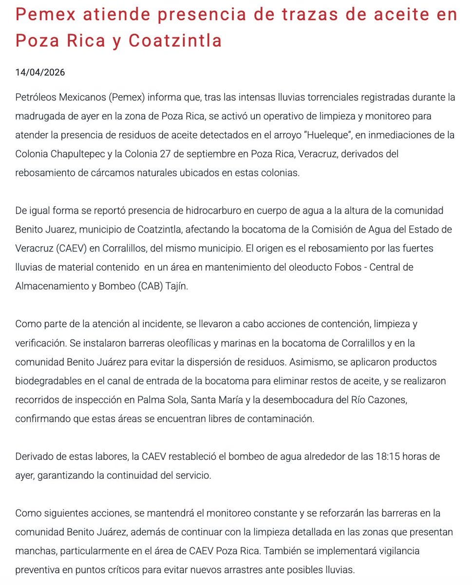 Veracruz.- Pemex confirmó este 14 de abril un derrame de residuos de aceite en el arroyo Hueleque, en Poza Rica, y en un cuerpo de agua en Coatzintla, que incluso afectó temporalmente la bocatoma de la CAEV y dejó sin agua potable a miles de veracruzanos. Según el comunicado oficial de la paraestatal, todo fue por las lluvias torrenciales de la madrugada del lunes: cárcamos naturales rebosaron y un área en mantenimiento del oleoducto Fobos-CAB Tajín escupió hidrocarburos. Ya instalaron barreras y limpiaron, dicen, y el servicio de agua ya volvió. Punto.