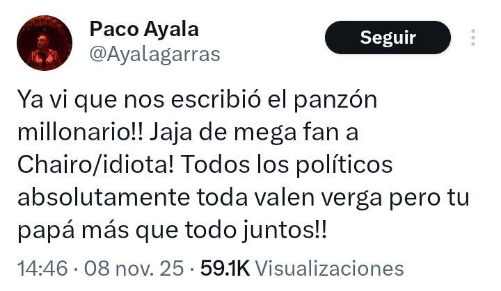 CDMX.- El bajista de Molotov, Paco Ayala, encendió las redes con una réplica mordaz a José Ramón López Beltrán, hijo del expresidente Andrés Manuel López Obrador, tras un intercambio que destapa las tensiones entre el rock provocador y el discurso oficialista de la Cuarta Transformación (4T). La polémica arrancó el 2 de noviembre, cuando López Beltrán minimizó las críticas de la banda durante un concierto en el Palacio de los Deportes, afirmando que Molotov “dejó de ser relevante” y defendiendo los logros de la 4T. Ayala contraatacó con “Ya vi que nos escribió el panzón millonario!! Jaja de mega fan a Chairo/idiota! Todos los políticos absolutamente toda valen verga pero tu papá más que todo juntos!! “.