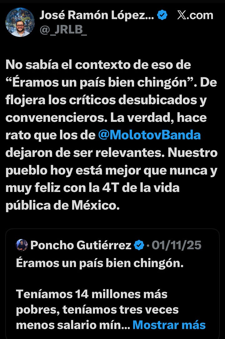 La discusión, que sigue creciendo con más de 2,000 interacciones en pocas horas, deja preguntas abiertas: ¿es Molotov un espejo de las frustraciones sociales o un eco nostálgico de un pasado contestatario? Lo cierto es que esta batalla verbal no solo revive el legado de la banda, sino que pone en jaque la narrativa oficialista en un momento en que México evalúa el saldo de seis años de transformación.