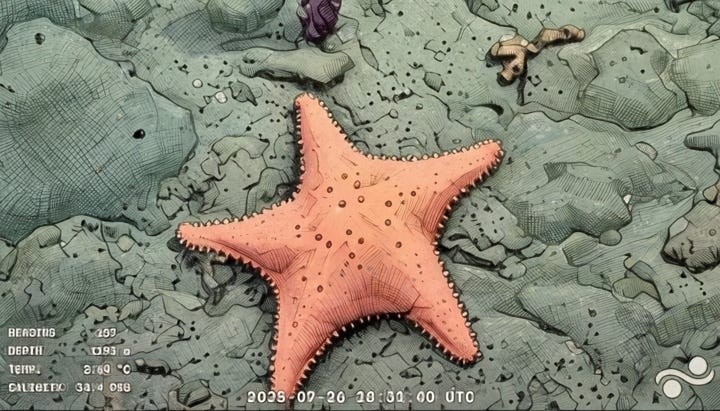 A más de tres kilómetros de profundidad, donde la presión es tan alta que ni tu teléfono sobreviviría, esta estrella de mar no está sola. Está rodeada de ofiuros y otras criaturas que, lamentablemente, no se parecen a Gary o Calamardo. Lo más gracioso es que, cuando la cámara se acerca, los investigadores no pueden resistirse: "Sí, creo que todos pensamos lo mismo", refiriéndose a un beso. Porque, claro, ¿qué sería de Patricio sin su toque de excentricidad?