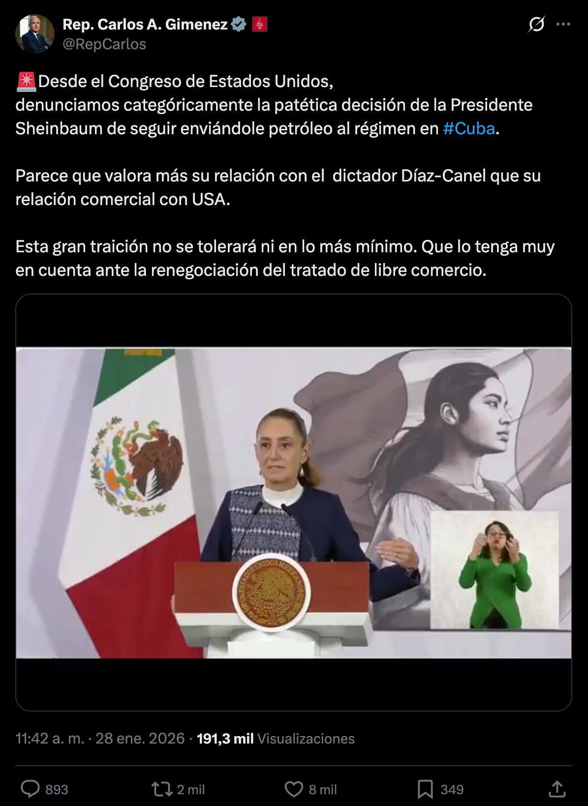 Según datos de Kpler y reportes de Reuters, México ha exportado un promedio de 12,284 barriles diarios de crudo a Cuba en los últimos meses, convirtiéndose en su principal proveedor tras la caída de Maduro en Venezuela. Fuentes del gobierno mexicano indican que la administración Sheinbaum evalúa pausar estos envíos para no irritar al gobierno de Trump, mientras legisladores cubano-estadounidenses como María Elvira Salazar y el propio Giménez presionan por sanciones. Publicaciones en X de analistas destacan que estos subsidios, valorados en millones, podrían interpretarse como financiamiento indirecto a un régimen autoritario, cuestionando si Cuba paga o si es puro regalo.