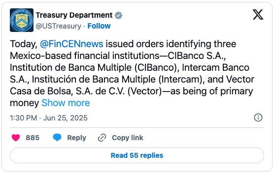 Las sanciones, emitidas por la Red de Control de Delitos Financieros (FinCEN) con base en la Ley de Sanciones contra el Fentanilo y la Ley FEND Off Fentanyl, acusan a las tres instituciones de haber lavado millones de dólares para cárteles mexicanos durante años, además de facilitar pagos para adquirir precursores químicos desde China, esenciales para la producción de fentanilo. En el caso de Vector, el Tesoro la vinculó directamente con el Cártel de Sinaloa y el Cártel del Golfo.