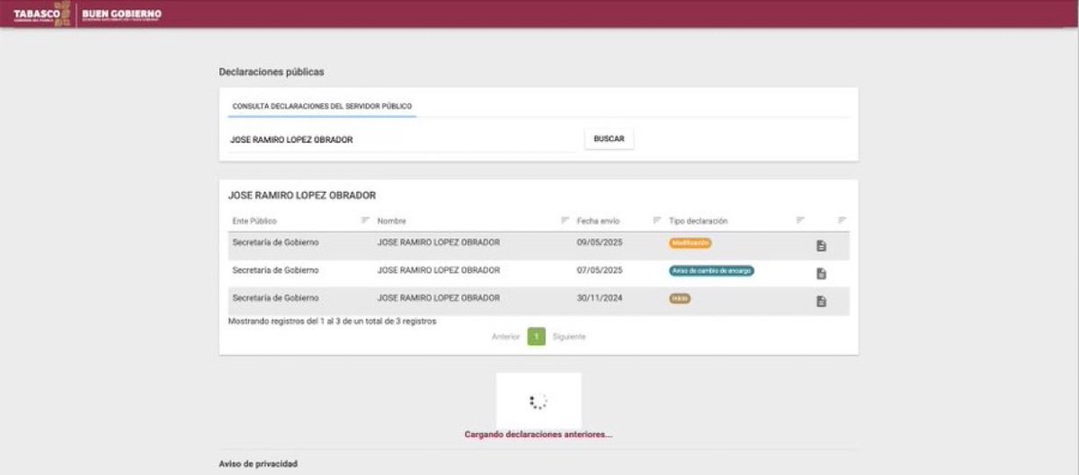 Tabasco.- La transparencia prometida por el gobierno de Morena vuelve a tambalearse. Esta tarde, el portal de declaraciones patrimoniales del estado de Tabasco mostró un mensaje inquietante: la declaración de 2020 del secretario de Gobierno, José Ramiro López Obrador —hermano del expresidente Andrés Manuel López Obrador—, ha desaparecido. En su lugar, solo aparece un frío “Cargando declaraciones anteriores”, dejando más preguntas que respuestas.