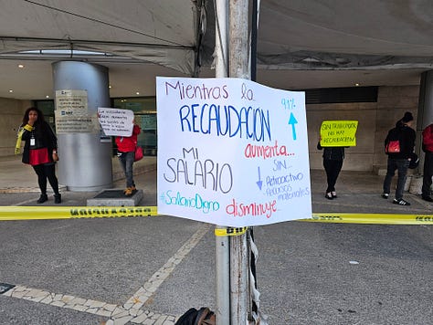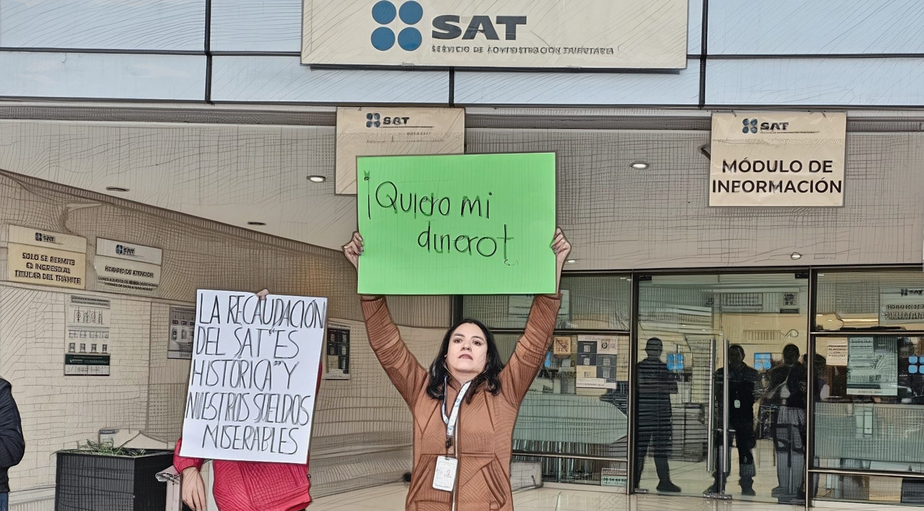 CDMX.- Este martes 14 de octubre, las oficinas del Servicio de Administración Tributaria (SAT) en Viaducto, casi esquina con Eje 3 en la Ciudad de México, amanecieron cerradas. No fue un fallo técnico ni una medida administrativa: trabajadores del organismo, hartos de promesas incumplidas, bloquearon las entradas con pancartas que gritan verdades incómodas. “¡Quiero mi dinero!”, reza un cartel verde sostenido por una empleada, mientras otro denuncia: “La recaudación del SAT es histórica y nuestros sueldos miserables”. La escena, refleja un malestar que va más allá de un simple reclamo salarial.