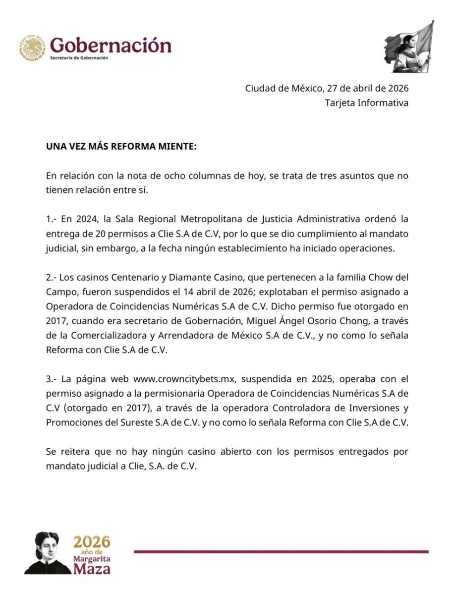 CDMX.- En el último año de AMLO, con Luisa María Alcalde al frente de Gobernación, la Dirección General de Juegos y Sorteos otorgó 20 permisos para casinos a Operadora Clíe S.A., empresa ligada a la familia de Hernán Bermúdez Requena —exsecretario de Seguridad de Tabasco, acusado de asociación delictiva, secuestro y extorsión, y señalado como líder de “La Barredora”—. La investigación de Mexicanos Contra la Corrupción y la Impunidad, publicada por Reforma, documenta los nexos a través de socios compartidos y permisos previos que ya operaban casinos y apuestas en línea. Ayer, Segob y la propia Alcalde salieron a desmentirlo: “cumplimos una orden judicial del TFJA” y “no hay vínculo alguno”. Ella misma lo repitió en video: “Quieren vincularme con quien fuera secretario de Seguridad de Tabasco”.
