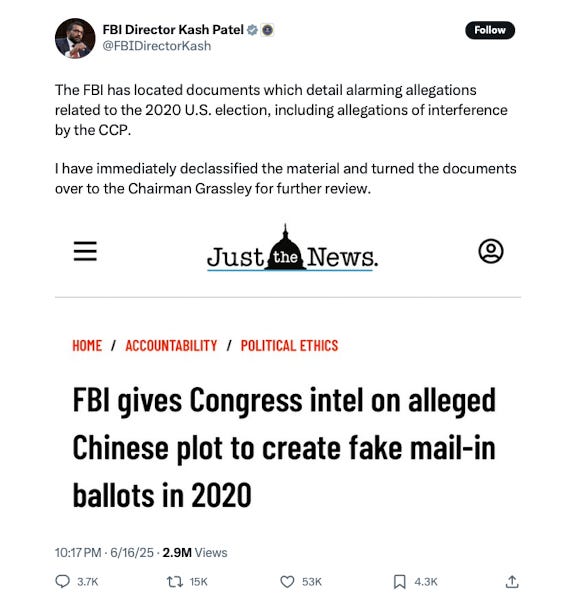 Washington.- El director del FBI, Kash Patel, ha sacudido el panorama político al desclasificar documentos que, según él, prueban un presunto plan del Partido Comunista Chino (PCC) para interferir en las elecciones de 2020 en EE. UU., incluyendo el uso de boletas por correo falsas a favor de Joe Biden. La noticia, difundida en redes sociales, cita a Patel afirmando que los documentos fueron entregados al senador Chuck Grassley para su revisión, un paso que reaviva debates sobre la legitimidad de aquel proceso electoral.