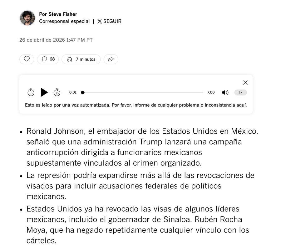 Esto no es aislado. Es la radiografía de un gobierno que entregó plazas enteras al crimen, miró para otro lado con los cárteles y ahora finge sorpresa cuando Estados Unidos cierra la puerta. Rocha y compañía pueden seguir gobernando Sinaloa; el problema es que México ya no se puede dar el lujo de tener narco-gobernadores impunes. La visa revocada es solo la primera factura que llega. La verdadera cuenta la pagan los sinaloenses y los miles de muertos que esta complicidad ha dejado. Basta ya de excusas y “no está solo”. Que rindan cuentas, aquí o allá.