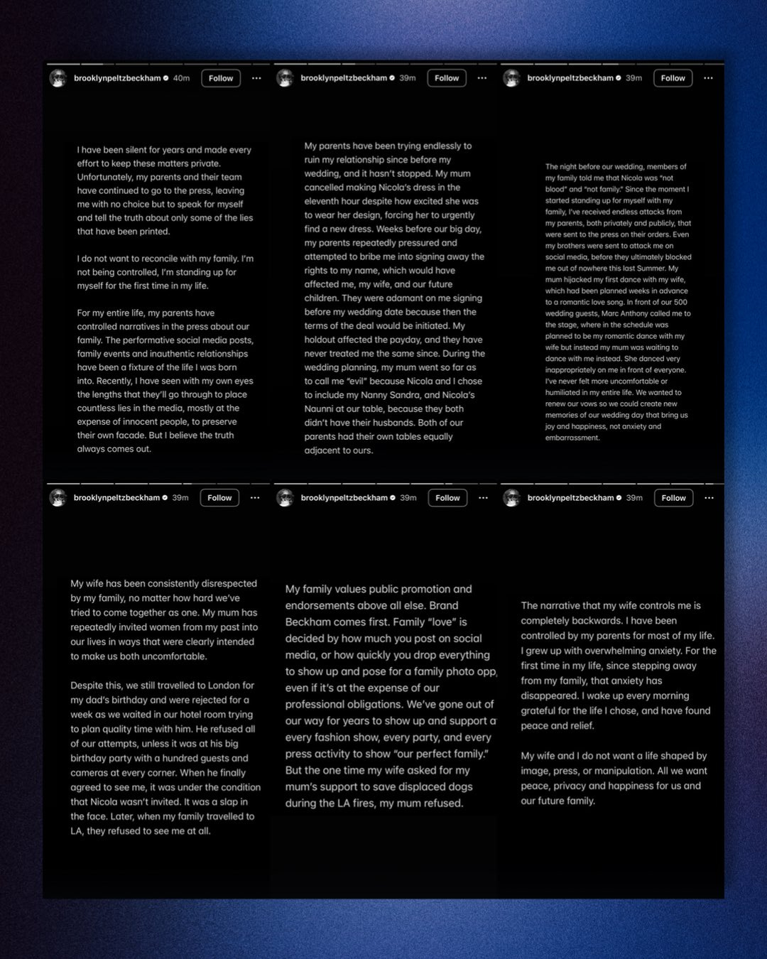 Brooklyn Beckham rompe el silencio: "No quiero reconciliarme con mi familia. No estoy siendo controlado, estoy defendiendo mi posición por primera vez en mi vida"