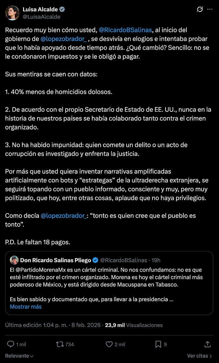 CDMX.- En un acalorado intercambio en X, el magnate Ricardo Salinas Pliego arremetió contra Morena, llamándolo un “cártel criminal” dirigido desde Tabasco, acusando al partido de alianzas con narcos, impunidad y violencia descontrolada durante el sexenio de López Obrador. Luisa Alcalde, presidenta de Morena, contraatacó recordando los elogios iniciales de Salinas al gobierno y atribuyendo su cambio de postura a la negativa de condonarle impuestos, que ahora debe pagar en 18 abonos tras un acuerdo con el SAT por 32 mil millones de pesos, según confirmó la autoridad fiscal en enero de 2026. Alcalde defendió al régimen con datos: 40% menos homicidios dolosos desde septiembre de 2024, colaboración inédita con EE.UU. contra el crimen –como elogió el secretario Marco Rubio– y cero impunidad.