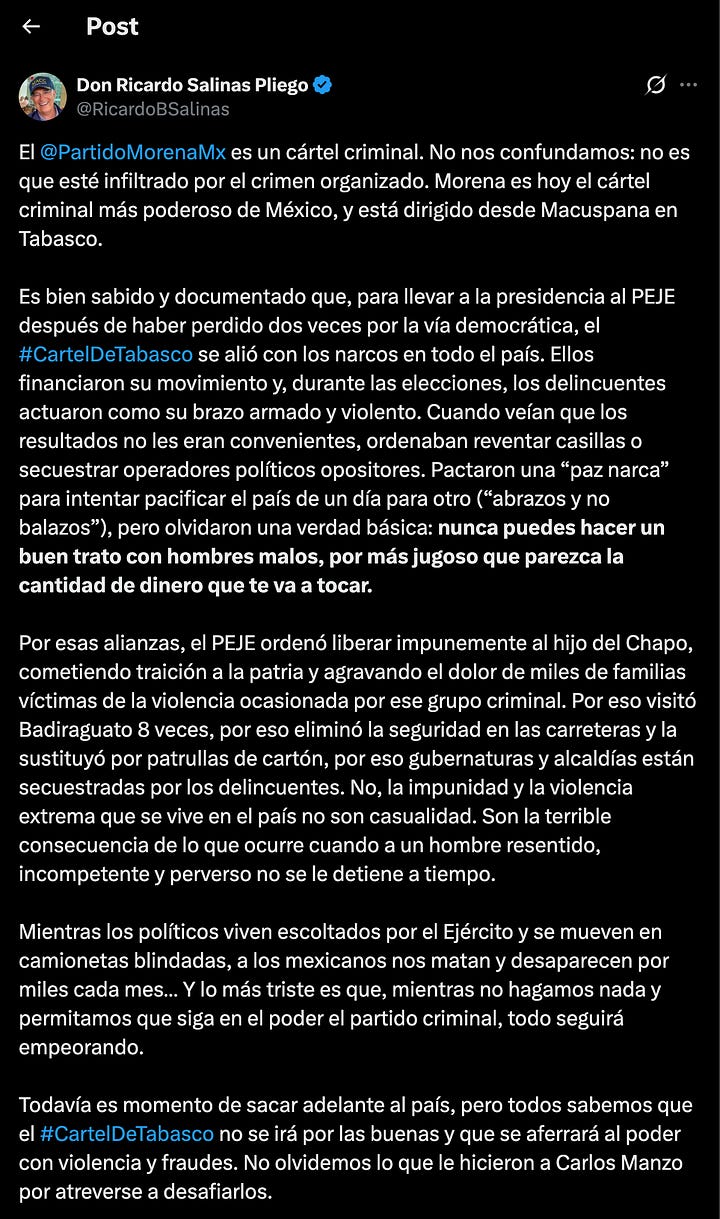 Salinas Pliego acusa a Morena de ser un “cártel criminal” dirigido desde Tabasco