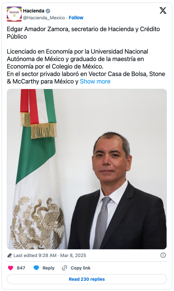 El 8 de marzo, la cuenta oficial de Hacienda en X destacó la experiencia laboral de Amador Zamora, tras su nombramiento como secretario por la presidenta Claudia Sheinbaum, en reemplazo de Rogelio Ramírez de la O.