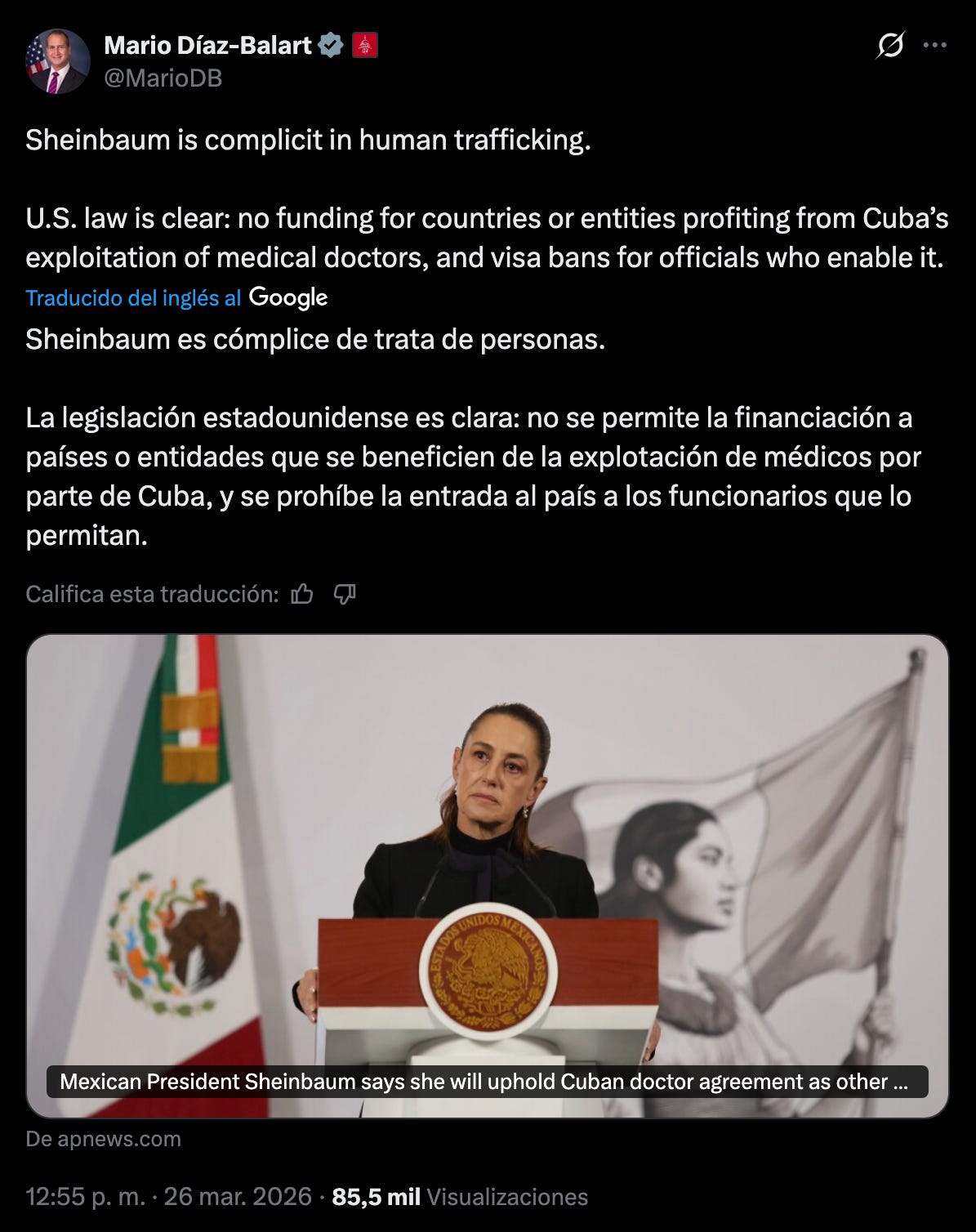 EU.- El congresista cubanoamericano Mario Díaz-Balart lo dijo sin anestesia: Claudia Sheinbaum es cómplice de trata de personas. Y no es retórica barata. Este 26 de marzo, el republicano de Florida citó la ley clara de Estados Unidos: cero fondos ni visas para quienes lucren con la explotación de médicos cubanos por el régimen de La Habana. El detonante fue la declaración de Sheinbaum del 25 de marzo, donde confirmó que México mantendrá el acuerdo bilateral pese a que Honduras, Jamaica y otros ya echaron a los galenos cubanos ante la presión de Washington.
