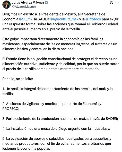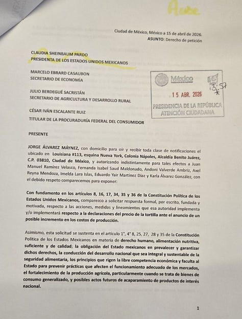 La tortilla ya ronda los 24 pesos promedio nacional y los productores advierten un aumento de 2 a 4 pesos en los próximos días. Máynez tiene razón en una cosa: no se puede tratar como simple capricho del mercado. Pero tampoco se resuelve con más control de precios ni con más burocracia. Eso solo genera escasez, mercado negro y más presión sobre los que menos tienen.