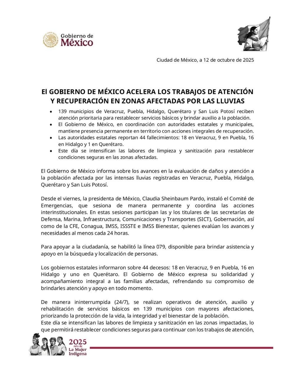 CDMX.- En medio de las inundaciones que han dejado al menos 44 fallecidos: 18 en Veracruz, 9 en Puebla, 16 en Hidalgo y 1 en Querétaro y decenas de desaparecidos, la presidenta Claudia Sheinbaum finalmente pisó el terreno este domingo. Sin embargo, la pregunta que muchos se hacen es: ¿llegó demasiado tarde ante una tragedia que ya ha arrasado 139 municipios?