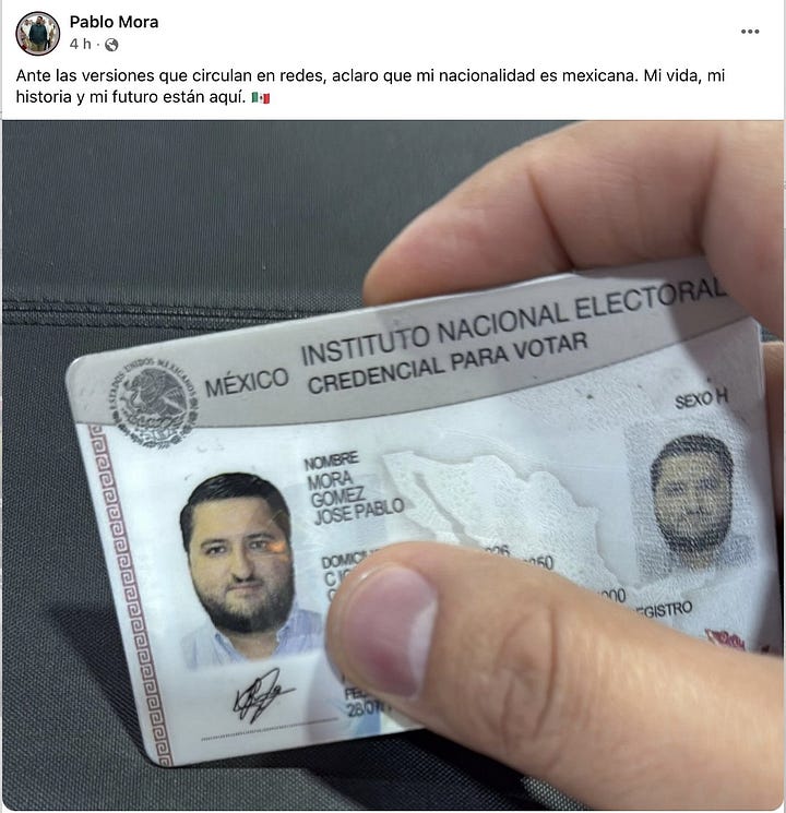Tabasco.- En medio de un torbellino de acusaciones, el subsecretario de Gobierno de Tabasco, José Pablo Mora Gómez, alias “Pablo Mora”, salió a defender su nacionalidad mexicana mostrando su credencial del INE en redes sociales. “Ante las versiones que circulan, aclaro que mi nacionalidad es mexicana. Mi vida, mi historia y mi futuro están aquí”, escribió, pero los hechos revelan una realidad más turbia: nacido en Costa Rica, Mora se naturalizó apenas en enero de 2025, según reportes de medios como XEVT y Diario de Tabasco. Su nombramiento como subsecretario ocurrió el 1 de octubre de 2024, bajo el gobernador Javier May de Morena, cuando aún era extranjero, violando posiblemente el artículo 32 de la Constitución que exige ciudadanía mexicana para cargos públicos clave.