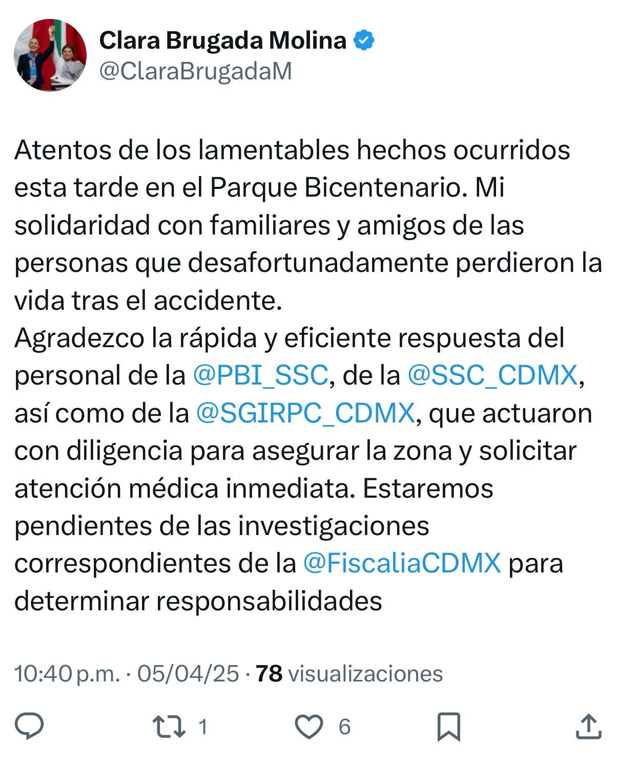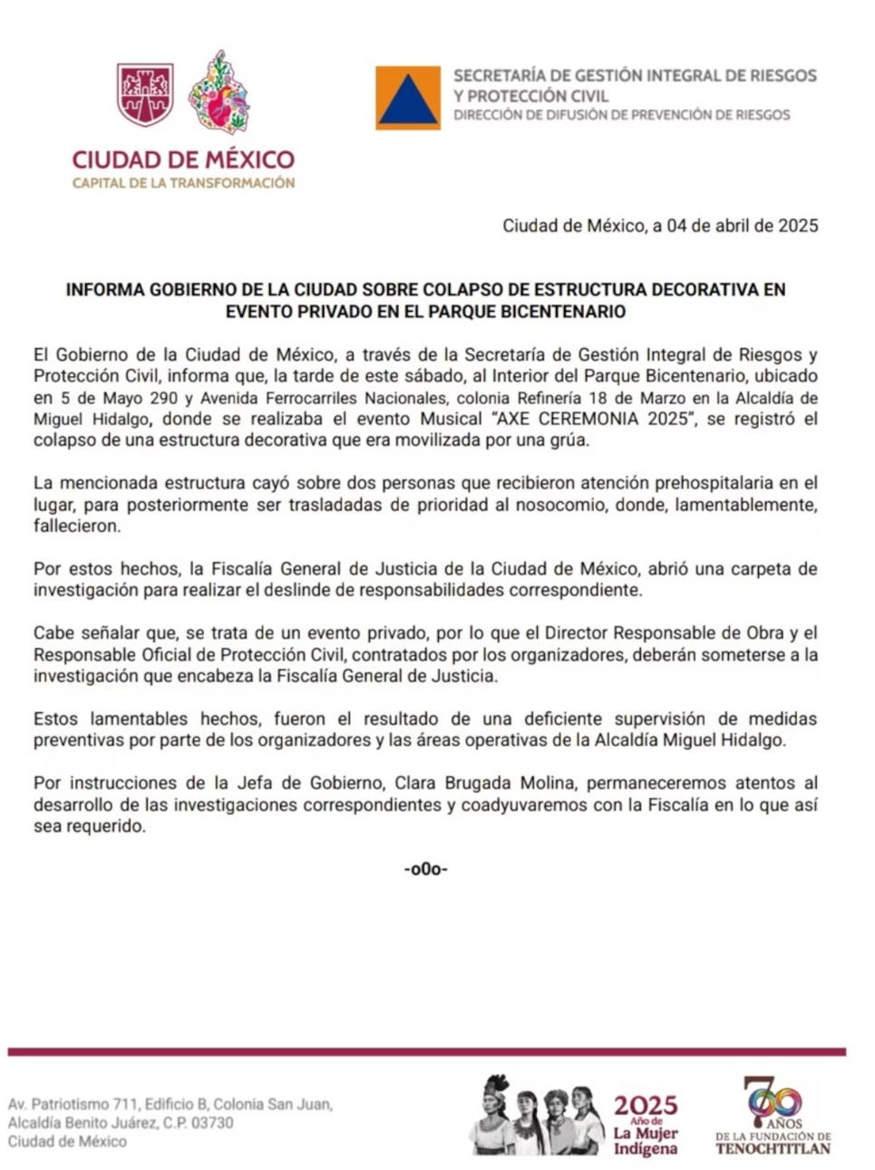 Según la Secretaría de Gestión Integral de Riesgos y Protección Civil, dos personas recibieron atención prehospitalaria en el lugar, pero fallecieron tras ser trasladadas a un hospital. La Secretaría de Seguridad Ciudadana (SSC) indicó que fuertes vientos habrían provocado el colapso de la estructura, que formaba parte de la decoración del evento. Inicialmente, se reportaron dos lesionados, aunque se dijo que no había claridad sobre el estado de las víctimas en ese momento.